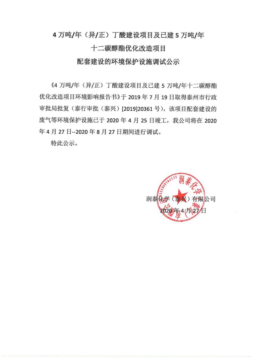 4万吨/年(异/正)丁酸建设项目及已建5万吨/年十二碳醇酯优化改造项目配套建设的环境保护设施调试公示