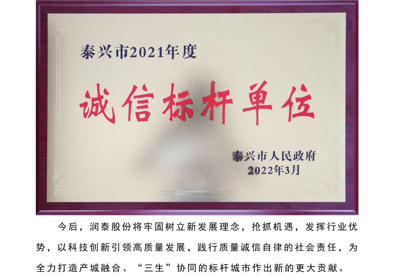 润泰化学(泰兴)有限公司荣获“诚信标杆单位代表企业”称号